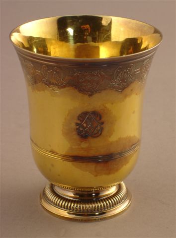 TIMBALE en vermeil. Col gravé de motifs de coquilles, panse monogrammée, piédouche godronné et daté 1912 - 1962. Poinçon Minerve. Orfèvre Puiforcat.