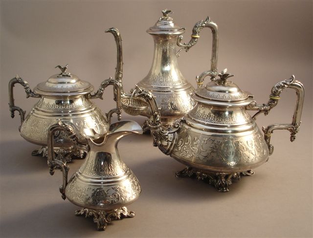 SERVICE à THÉ et à CAFÉ 4 pièces, en argent comprenant : une théière avec un filtre à thé en argent, une cafetière, un pot à lait et un sucrier. Prises en colombe posée sur une fleurette, couvercles et cols gravés de feuilles d'acanthe. Panses gravées d'enroulements et de médaillons flanqués de feuilles d'acanthe et monogrammés. Pieds ajourés d'agrafes affrontées entourant des feuilles d'acanthe. Poinçon Minerve.