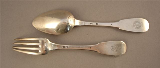 Pour la fourchette, poinçon de titre au premier coq passant pour Paris entre 1803 et 1809. Poinçon de moyenne garantie pour Paris.
