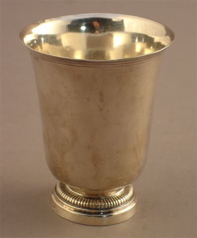 TIMBALE en argent. Col mouluré, piédouche godronné, monogrammé JB. Poinçon de jurande de la ville d'Orléans. Poinçon de maison commune pour Orléans entre 1780 et 1782. Premier coq chantant pour la province entre 1818 et 1838. Poinçon de petite garantie. Poinçon de titre au crabe pour les petites pièces.