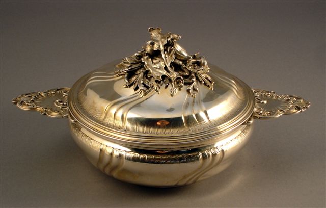 LÉGUMIER COUVERT en argent à oreilles stylisées d'acanthes, fretel orné de feuillages, légumes et champignons, panse et ombilic aux flots ondés. Style Rocaille de qualité, inspiré des oeuvres de Thomas Germain. Travail du maître orfèvre CARDEILHAC. Poinçon Minerve. Poids 1.290 g. Long. 32, haut.15 cm.