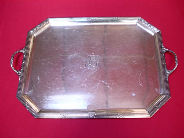 PLATEAU de SERVICE rectangulaire à pans en argent, orné d'un large bordure de joncs rubannés. Anses latérales agrémentées de feuilles d'acanthe.