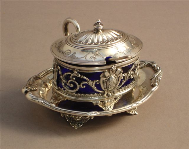 MOUTARDIER de forme ovale sur son assiette de présentation en argent et verre bleu. Couvercle godronné dans sa partie supèrieure, en doucine gravé de rinceaux dans sa partie inférieure. Prise en toupie. Récipient en verre bleu pris dans une monture de rinceaux ajourés entourant des médaillons monogrammés. L'ensemble repose sur un double filet vertical orné d'une frise de feuilles d'eau auquel se rattachent les quatre pieds en accolades affrontées entourant une feuille d'acanthe. Assiette de présentation de forme ovale. Extrémités ornées de feuilles d'acanthe. Contour souligné d'un filet enrubanné. Pieds en accolades affrontées entourant une feuille d'acanthe. Poinçon Minerve. Joint, une cuillère à moutarde.