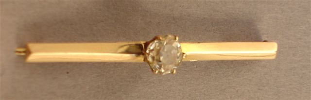 BROCHE baguette en or, ornée d'un diamant de taille ancienne d'environ 0,75 carat. Poids brut 3,7 g.