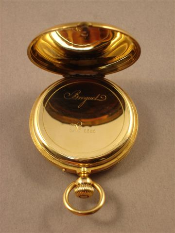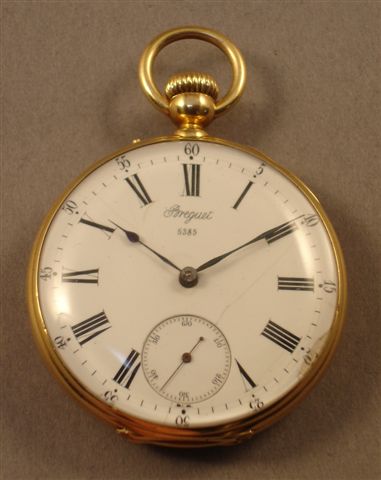 MONTRE DE POCHE en or de marque Bréguet n° 5385. Cadran émaillé à double affichage, secondes, aiguilles en acier. Monogrammée "CN".