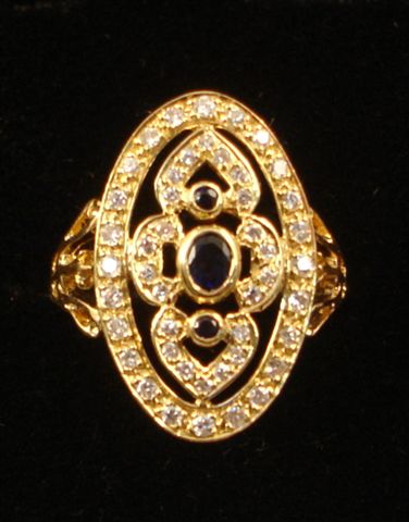 BAGUE de forme ovale en or jaune. Ajourée, sertie clos de trois petits saphir et de nombreux brillants. Poids : 4,3 g.