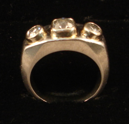 BAGUE en platine ornée en ligne de 3 diamants taille ancienne, montés en cabochon : 2 de 0,20 carat encadrant 1 de 0,50 carat. Poids brut 18,1 g.