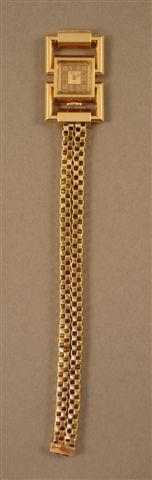 MONTRE-BRACELET de dame en or jaune. La montre de forme carrée, mouvement mécanique, les attaches de forme rectangulaire ajourée, le tour de poignet à deux brins. BOUCHERON. (petit accident au verre).