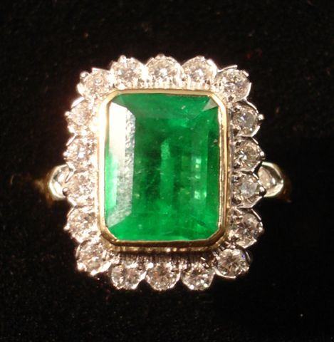 BAGUE rectangulaire en or ornée en son centre d'une émeraude de Colombie en sertie clos, rectangulaire et à pans coupés d'environ 5.01 carats, entourée de 18 + 2 diamants d'environ 1 carat. Poids brut : 10,35 g.