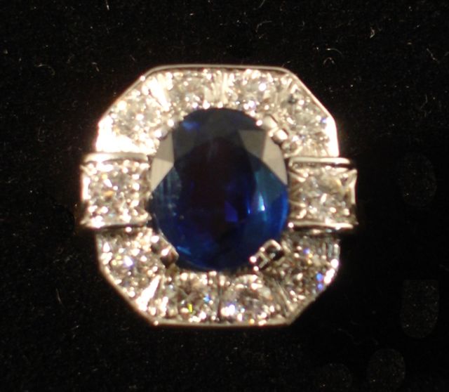 BAGUE rectangulaire à pans en or, sertie d'un saphir d'environ 5,20 carats, entouré de 10 diamants taille moderne d'environ 1,25 carats. Poids brut : 9,50 g.