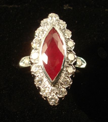 BAGUE marquise en or blanc ornée au centre, en serti clos, d'un rubis (probablement Birman) d'environ 3,04 carats, entouré de 16 +2 diamants taille moderne d'environ 1,12 carats. Poids brut : 8,50 g.