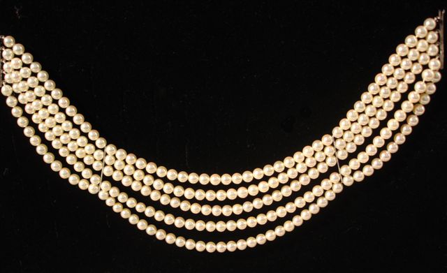 COLLIER à 5 rangs, de 251 perles de cultures (7 x 7,5 mm). Fermoir et intercalaires en or blanc.