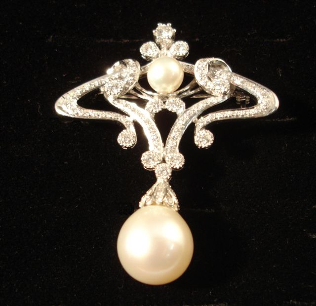 BROCHE en or blanc ornée de 2 perles d'eau douce agrémentées de 79 diamants d'environ 1,51 carats. Poids brut : 19,85 g.