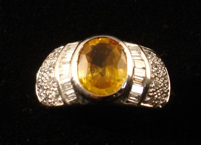 BAGUE jonc en or blanc avec au centre, en serti clos, un saphir jaune d'environ 2,82 carats, agrémenté de 14 diamants taille baguette d'environ 0,30 carat et de 22 diamants taille moderne d'environ 0,63 carat. Poids brut : 9,40 g.