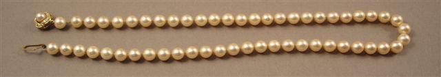 COLLIER de 54 PERLES de culture, sans chute d'environ 1,1 à 1,3 grains. Le fermoir en or, est formé de 4 croissants enserrant une perle.