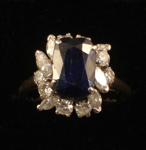 BAGUE en or blanc, sertie d'un saphir de taille rectangulaire dans un entourage de 14 diamants brillants ronds, ou taillés en navette.