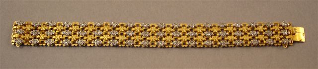 BRACELET ruban articulé, en or aux motifs floraux, ornés d'éclats de diamants sur 3 rangs. Long. 18 cm. Poids 38,7 g. Dans un écrin orné d'une couronne, et signé MELLERIO 9, rue de la Paix à Paris.