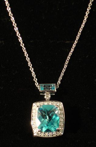 COLLIER en or blanc orné de deux topazes rectangulaires (dont une facettes) d'environ 4,53 carats et de 27 diamants d'environ 0,25 carat. Poids brut : 8,35 g.