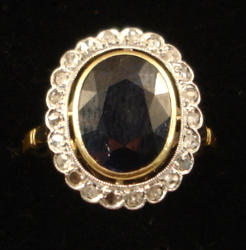 BAGUE en or jaune ornée d'un saphir dans un entourage de petites pierres blanches.