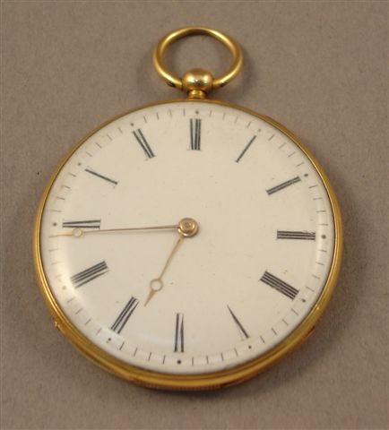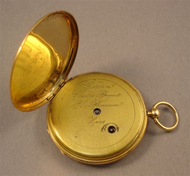 MONTRE SAVONNETTE d'homme en or, mécanisme à clef. "Gaudron, élève de Bréguet, pl. Beauveau Paris". Diam. 4,5 cm. Poids brut 58,6 g.