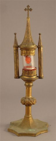 RELIQUAIRE en bronze doré de forme cylindrique. La relique est présentée dans un cylindre de verre flanqué de deux colonnes et surmonté d'une toiture circulaire miniature de bronze doré. L'ensemble repose sur un fût à pans agrémenté d'un bulbe, se terminant par un socle octogonal.