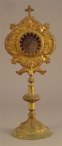 RELIQUAIRE en bronze doré présentant un ensemble de reliques dans une fenêtre ronde contenue dans un médaillon à quatre lobes ornés de végétaux stylisés et surmontés d'une croix. L'ensemble repose sur un fût à bulbe orné d'une frise d'acanthes se terminant par un piédouche.