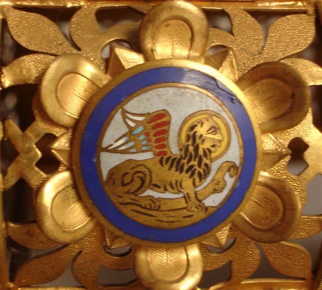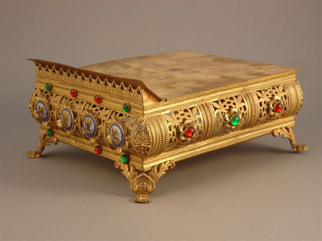 THABOR formant pupitre en bronze doré, ciselé et ajouré, orné de cabochons et de médaillons émaillés. Le support de lecture à hauteur réglable en bronze doré gravé d'une croix. Il repose sur un socle de forme rectangulaire, ajouré sur ses quatre côtés d'un décor de compartiments garnis à jour de végétaux stylisés. Le côté face au lecteur est orné de douze cabochons. Huit sertissent des éléments de verre rouges et verts à l'imitation de pierres précieuses. Quatre contiennent des médaillons circulaires émaillés à fond bleu figurant le tétramorphe. Un lion ailé pour Saint Marc, un ange pour Saint Matthieu, un aigle pour Saint Jean et un boeuf ailé pour Saint Luc. Les deux autres côtés sont ornés de trois cabochons en fleurettes sertissant des éléments de verre rouges et verts.