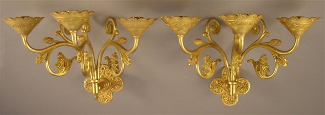 PAIRE D'APPLIQUES à trois lumières en bronze doré et ciselé. Bobèches coniques ornées de motifs géométriques. Elles reposent sur des enroulements figurant des pampres stylisées réunies en un fût que vient contenir l'attache murale constituée d'un balustre vertical se rattachant au centre d'un médaillon à quatre lobes orné de végétaux stylisés.
