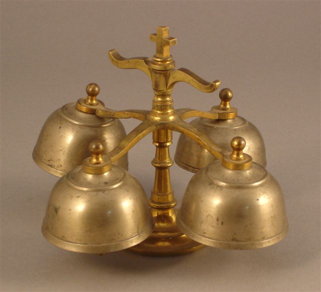 CARILLON de célébration en bronze doré et argenté. Surmonté d'une croix. Constitué de quatre cloches en bronze argenté réunies par un "X" de bronze doré soutenu par un fût annelé terminé par un piédouche.