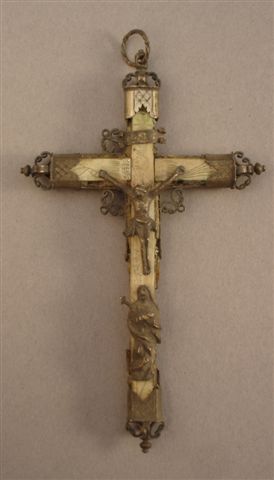 Ensemble de TROIS CRUCIFIX. Deux en métal argenté et bois noirci, le troisième en métal argenté et nacre.