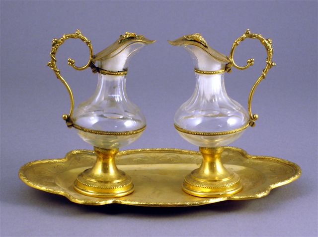PAIRE DE BURETTES en cristal et monture de bronze doré et leur plateau polylobé de forme ovale en bronze doré. Corps en cristal taillé, anses en bronze doré liées au col, opercules de bronze doré ornés d'une feuille de vigne sur laquelle repose une grappe de raisins pour l'une et un coquillage pour l'autre. Piédouches en bronze doré ornés de frises de perles.