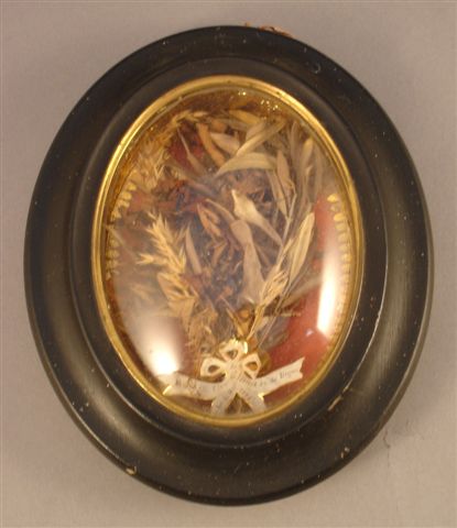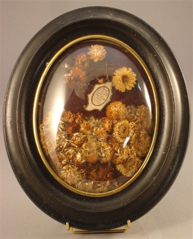 Ensemble de DEUX CADRES de forme ovale en bois noirci contenant des bouquets de fleurs séchées constitués le 15 août 1894 et le 26 mai 1885.