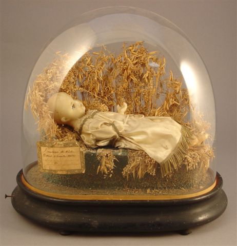 BOÎTE À MUSIQUE figurant une représentation en CIRE de l'Enfant Jésus, revêtu d'une tunique à franges dorées. Il repose sur un promontoir entouré d'herbes séchées. L'ensemble est protégé par un globe de verre, portant une étiquette manuscrite, reposant sur un socle ovale en bois noirci.
