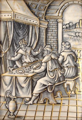 PLAQUE émaillée dans le goût de la production de Limoges au XVIIème siècle, figurant dans un camaïeu de gris rehaussé d'or le Christ chez les Pèlerins d'Emmaüs.