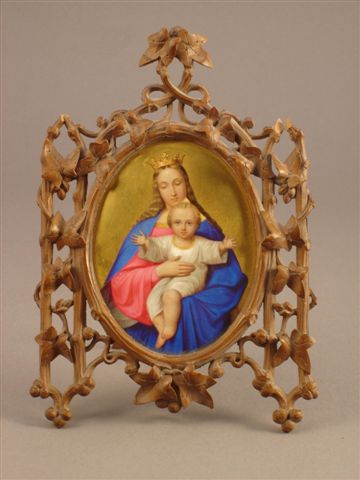 MÉDAILLON DE PORCELAINE représentant une Vierge à l'enfant. Entourage en bois ajouré sculpté de feuilles de lierre.