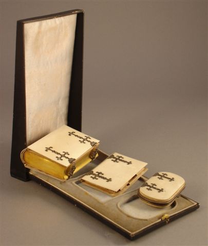 PARURE de première communion. Dans un coffret noir garni de velours gris : livre de messe "paroissien romain" imprimerie Mame à Tours, porte gousset et carnet de bal "souvenir". Ivoire os ? avec pentures et fermoir en acier damasquiné.
