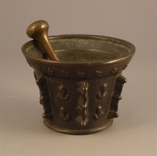 MORTIER en bronze et son pilon. Flanc orné d'accolades géométriques en relief.
