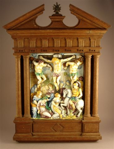 PLAQUE EN FAÏENCE DE GRAND FEU figurant en haut relief le Christ et les deux larrons sur le mont Golgotha. Travail italien ? Fin XIXème ?