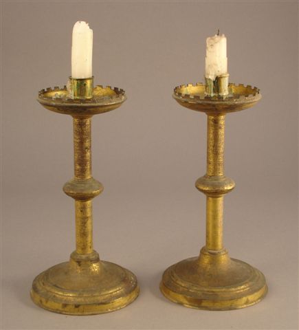 PAIRE DE FLAMBEAUX en bronze doré. Larges bobèches crénelées. Fûts droits à bulbes. Piédouches circulaires.