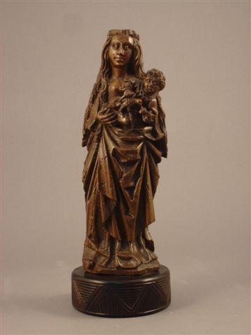 VIERGE A L'ENFANT. Statue en bois naturel sculpté, l'enfant tenant un oiseau. Haut. 33 cm.