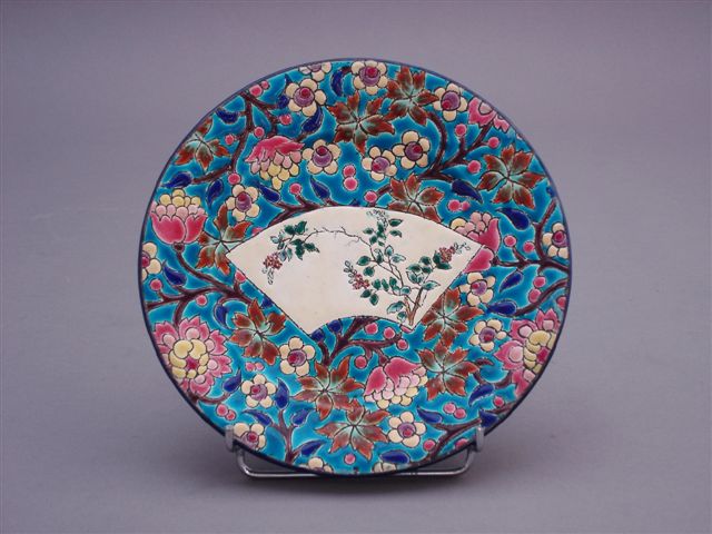 ASSIETTE à décor japonisant de branches fleuries dans une réserve en forme d'éventail. La réserve se détache d'un fond de fleurs polychromes sur fond bleu céruléen.