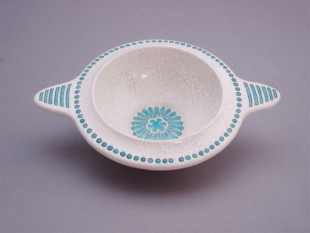 LONGWY. VIDE-POCHE à oreilles. Décor géométrique de lignes, points, et motif rayonnant en bleu turquoise sur fond blanc craquelé.