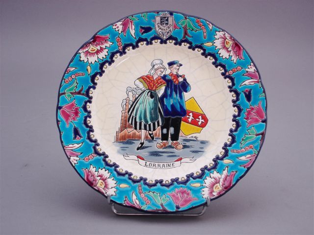 LONGWY. ASSIETTE régionale décorée d'un couple de Lorrains en habits traditionnels sur fond blanc craquelé. Le marli souligné d'une frise de motifs festonnés. Sur l'aile, des fleurs polychromes sur fond bleu.