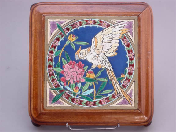 LONGWY. DESSOUS de PLAT carré décoré d'un perroquet aux ailes déployées sur un bouquet fleuri et sur un fond circulaire ceint d'une frise de fleurs.