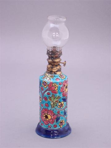 LONGWY, d'après. LAMPE à PÉTROLE, le fût de forme rouleau à décor de fleurs polychromes sur fond bleu céruléen.