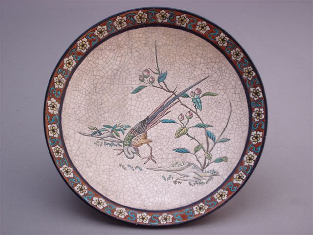 LONGWY. COUPE sur piédouche. Décorée d'un oiseau exotique près d'une branche fleurie d'inspiration japonaise sur fond crème craquelé. Le marli est bordé d'une frise de fleurettes, l'extérieur de la coupe orné de fleurs de pommier sur fond bleu céruléen.