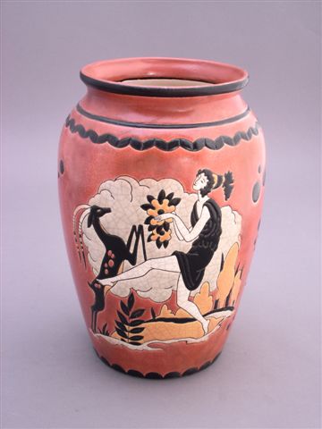 LONGWY. Grand VASE décoré d'une femme dansant avec une antilope dans un paysage, sur fond marron à ronds noirs.