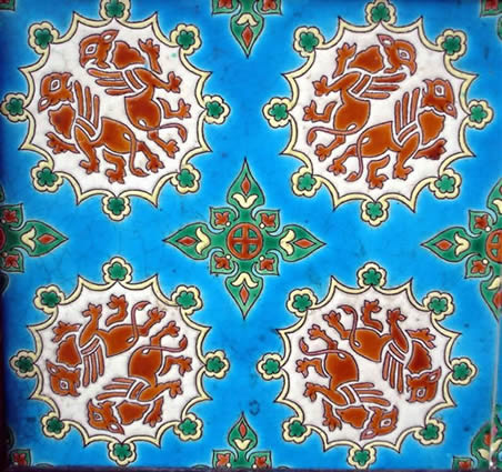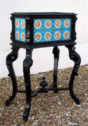 LONGWY. JARDINIÈRE en bois noirci, mouluré, sculpté et plaques de céramique de Longwy. Corps quadrangulaire orné de quatre plaques de céramique à motifs persans. Pieds galbés, entreroise chantournée centrée d'un vase.