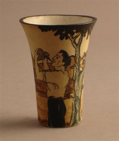 Petit VASE CORNET au décor de grand feu d'un paysan buvant à la gourde. Marqué VE.