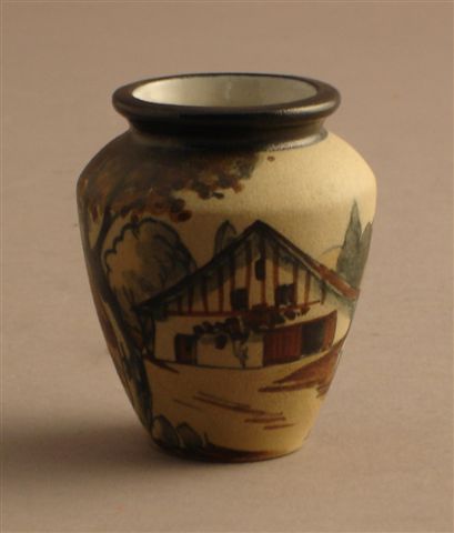 Petit VASE bursiforme à grand col. Panse décorée au grand feu d'un berger sous un arbre aux abords d'une habitation. Marqué RF et "david".